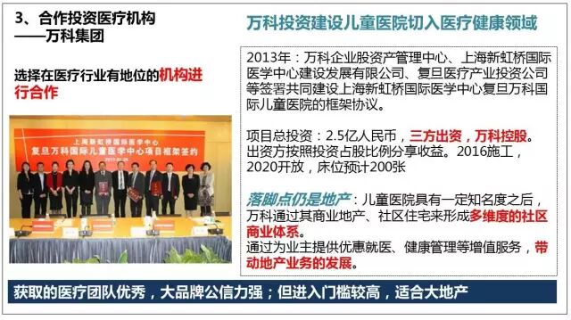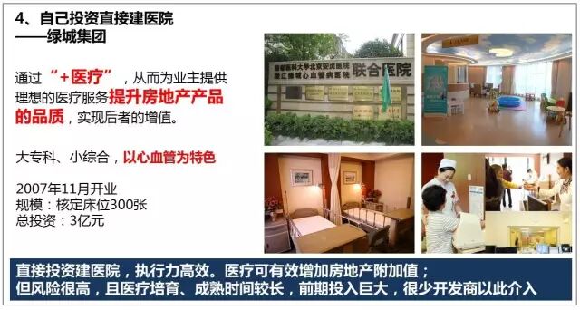 地产介入医疗领域,也不是啥新鲜事。如恒大集团通过股权收购介入;燕达在北京东郊大规模建设健康产业城;万科与医疗公司合作,投资建设儿童医院;绿城更直接,自建医院。具体的介入方式如下: